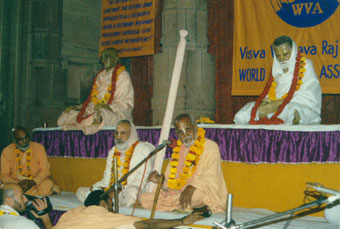 Srila Bhakti Vaibhava Puri Maharaja, the founder of theSri Caitanya Mission, is addressing the audience in the Radha Govindaji mandir of Srila Rupa Goswami in Vrindavan. 1996 WVA Kartik Mela in Rama Ekadhasi.