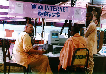 The Internet demonstration in Srivan Angan , Mayapur. Srilla B.B. Sajjan Maharaj, host and organizer of the WVA Mela 96 is receiving a tour of the WVA Hompage on the Internet.