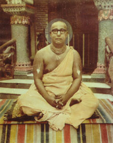 Srila Bhakti Saranga Goswami Maharaja, disciple of Srila Prabhupad Bhaktisidhanta Saraswati and founder of the Gaudiya Sanga. He renovated the imlitala temple on the bank of the yamuna which can be seen in the back of him. it was the great wish of his Spiritual Master that the Imlitala location would be served properly.