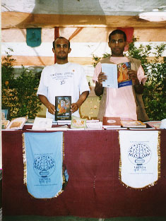 A Book table of the first WVA Nama Hatta trade show for transcendental exchange and enlivenment. This was at the WVA Mela in 1996 in Mayapur.